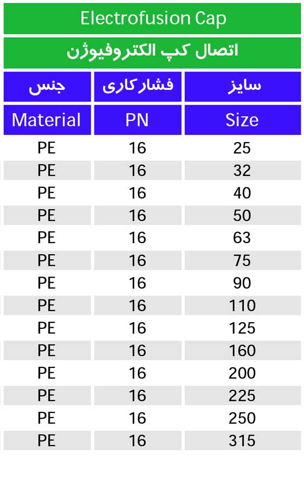 کپ الکتروفیوژن یکی از پرکاربردترین اتصالات الکتروفیوژنی می باشد که به منظور مسدود کردن انتهای لوله های پلی اتیلن و همینطور اتصال دو لوله با سایز مختلف به کار میرود . این اتصال همانند سایز اتصلات پلی اتیلینی در فشار کاری 16 بار با سایزهای مختلف قابل عرضه میباشد که در جدول زیرین قابل مشاهده می باشد.