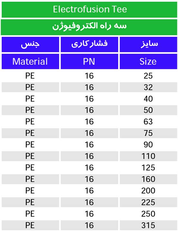 سه راهی مساوی الکتروفیوژن در اندازه های مختلف طراحی و تولید شده است. این سه راهی دارای فشارکاری 16 بار بوده و به منظور انشعاب گیری در دو مسیر متفاوت مورد استفاده قرار میگیرد.