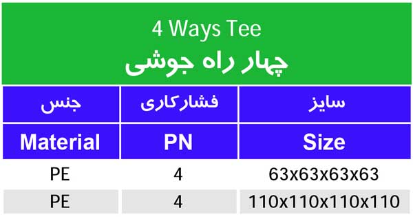 چهار راه جوشی فاضلابی تولید شرکت روتنگران پارسه با برترین و با کیفیت ترین مواد پلی اتیلنی با گرید PE100 در ابعاد مختلف تولید شده است که و علاوه بر مصرف در فاضلاب ، مواد شیمیایی ، اسیدی و نفتی، در بخش کشاورزی ( آبرسانی تحت فشار بوده) مورد استفاده قرار می گیرد و در مقایسه با اتصالات چدنی و فولادی بسیـار مقرون به صرفه میباشد.