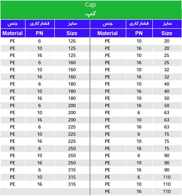 کپ جوشی لوله پلی اتیلن برای مسدود کردن انتهای خط لوله کاربرد دارد و به وسیله دستگاه جوش پلی اتیلن با انتهای خطوط و در جایی که نیاز به مسدود کردن میباشد جوشکاری میگردد، به کپ پلی اتیلن، درپوش نیز میگویند. کپ در سایز های 20، 25، 32، 40، 50، 63، 75، 90، 110، 125، 160، 180، 200، 225، 250، 315 میلیمتر تولید میشود. فشار هایی که بصورت استاندارد ساخته میشوند عبارتند از 6 بار، 10 بار، 16 بار است.